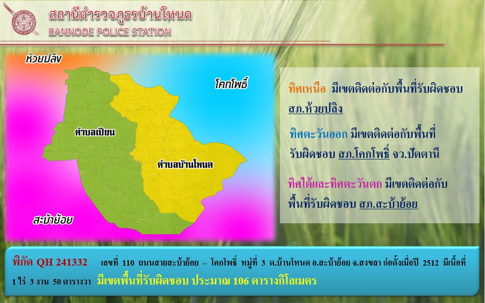 สถานีตำรวจภูธรบ้านโหนด มีพื้นที่รับผิดชอบ 2 ตำบล คือ ตำบลเปียน และตำบลบ้านโหนด
